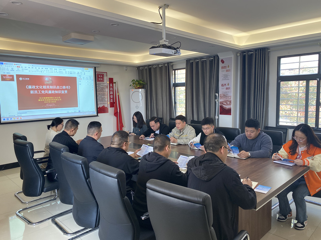 会议由新原料公司书记孔庆锐主持,首先由新原料公司纪检委员黄玉萍、第三分公司纪检委员张军政分别向新进员工发放了廉政文化相关知识点口袋书。接着,新原料公司经理马龙针对口袋书,主要从“八项规定主要内容”、“八项规定精神具体方向”等内容深入浅出地对新进员工进行了宣贯教育,提醒新进员工在大事上一定要泾渭分明,小节上时刻从严把握,哪些事能做,哪些事不能做,脑子里要有明确的界限。然后,第三分公司经理戴玉郎宣读了“汉江国有资本出资集团有限公司员工处分暂行规定(试行)”,让大家明晰了集团公司的党纪处分规定。随后,新进员工黄冬丽、刘桂烜代表发言,表达了自己的党风廉政学习感悟。最后,第三分公司党支部书记李爱国做会议总结,强调新进员工要时刻对照学习,严于律己,坚决与不良风气作斗争,踏踏实实做事,干干净净做人,时时刻刻守好初心,筑牢防线。