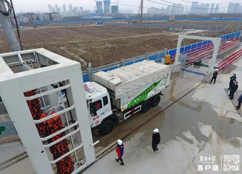 2月4日,龙门式洗车机对即将驶出工地的渣土车进行冲刷清洗。