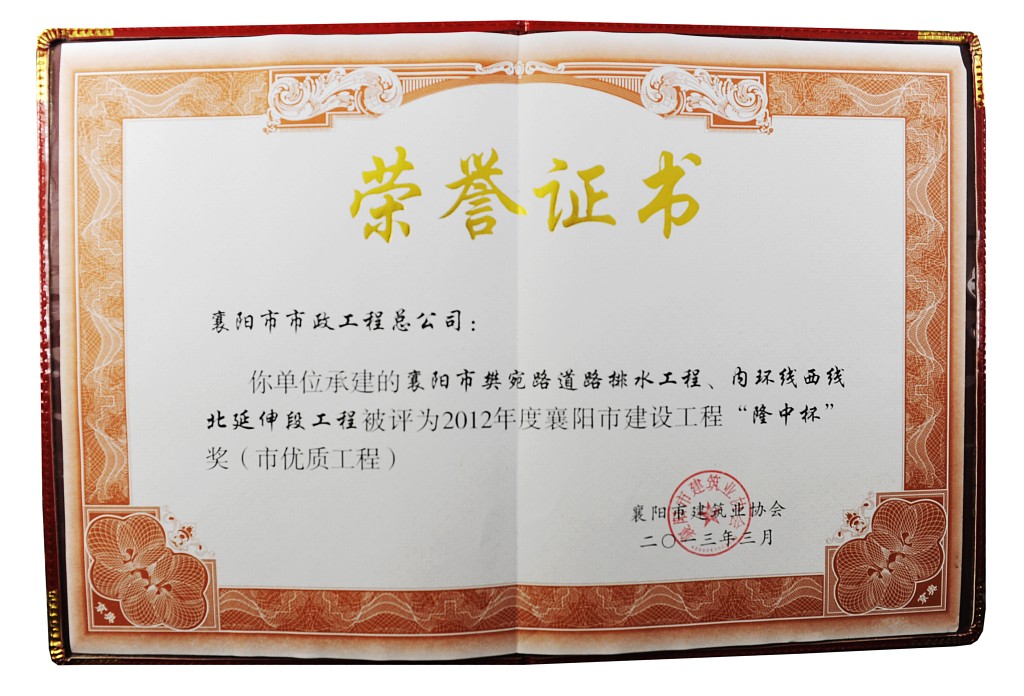 2012樊宛路AYX爱体育襄阳市“隆中杯”证书