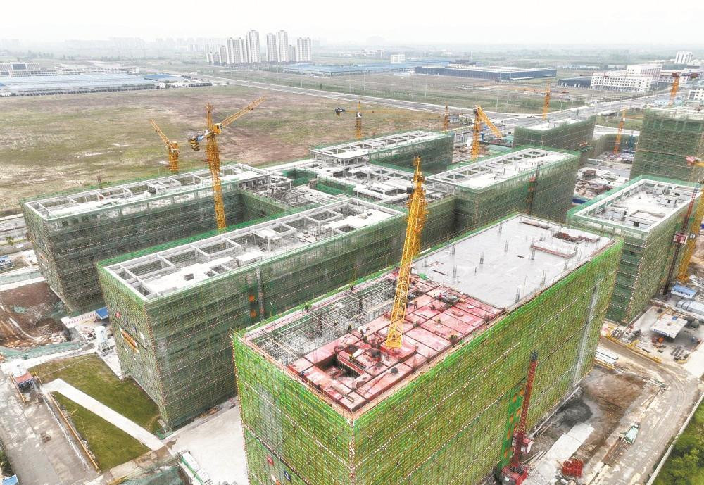 当日上午,记者在工地现场看到,施工人员正在最后一栋9层高的住院楼楼顶进行混凝土浇筑和钢筋捆扎,预计4月22日完成全部浇筑施工。