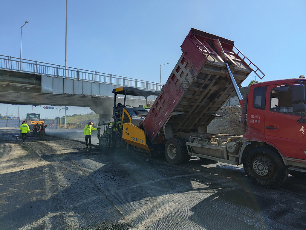 为确保本次摊铺作业的顺利进行,第三分公司提前谋划、统筹部署,组织召开摊铺施工生产工作会,确定最优施工工艺、原料及配合比。摊铺开始前,对技术管理人员、机驾人员、班组技术工人等分别进行了安全降温措施、安全管理及施工技术交底,此外在碾压过程中安排专人测量检验,对摊铺温度、摊铺速度、压路机碾压速度和碾压质量进行全程实时的记录,确保各项指标符合规范要求。